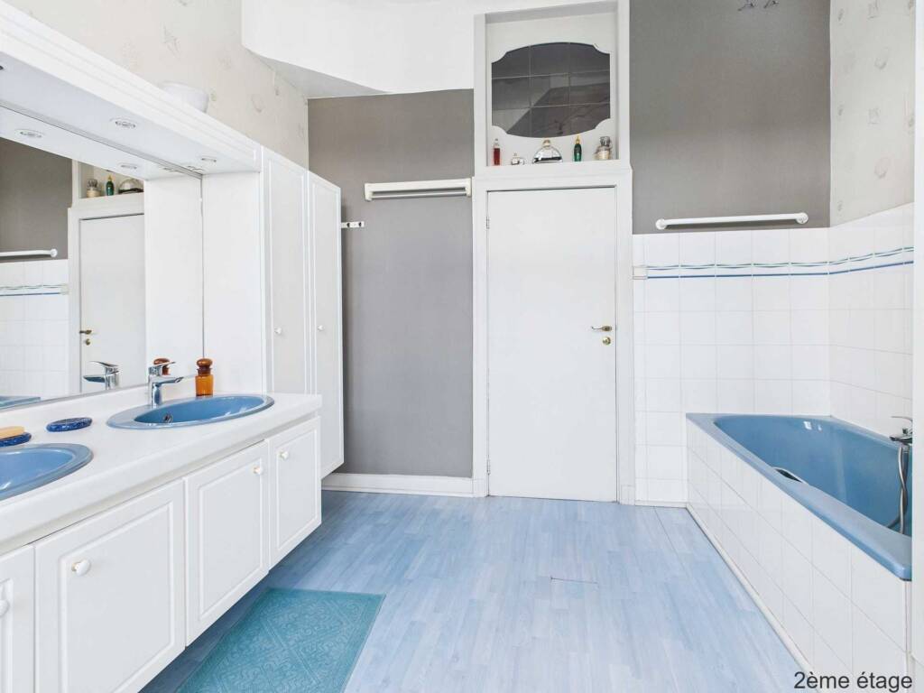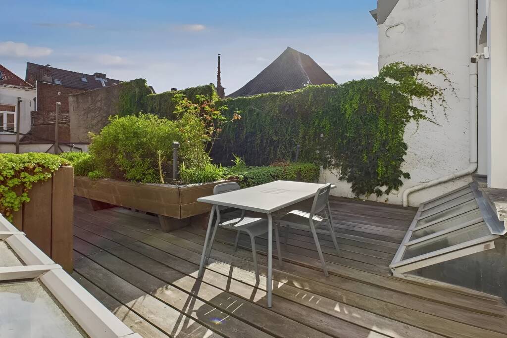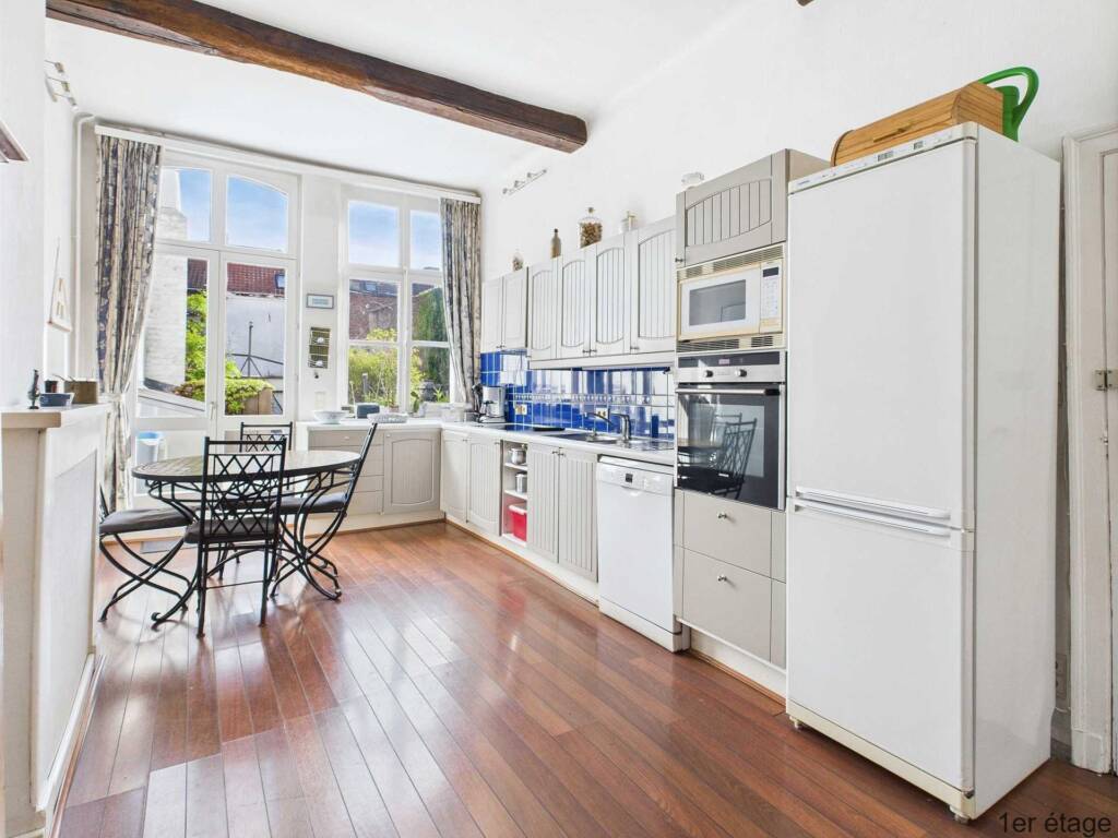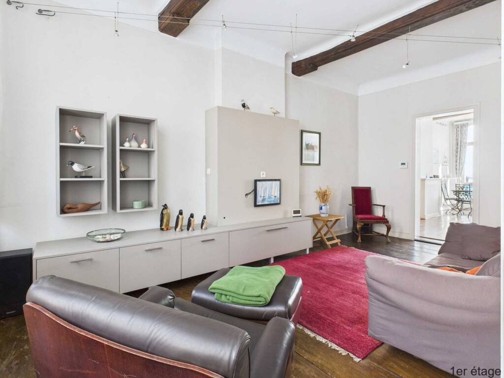 Op de eerste verdieping bestaat de leefruimte uit een hal die toegang geeft tot een volledig uitgeruste keuken, een badkamer met ligbad en wastafelmeubel, een woonkamer, een eetkamer en een mooi houten terras dat toegankelijk is vanuit de keuken.