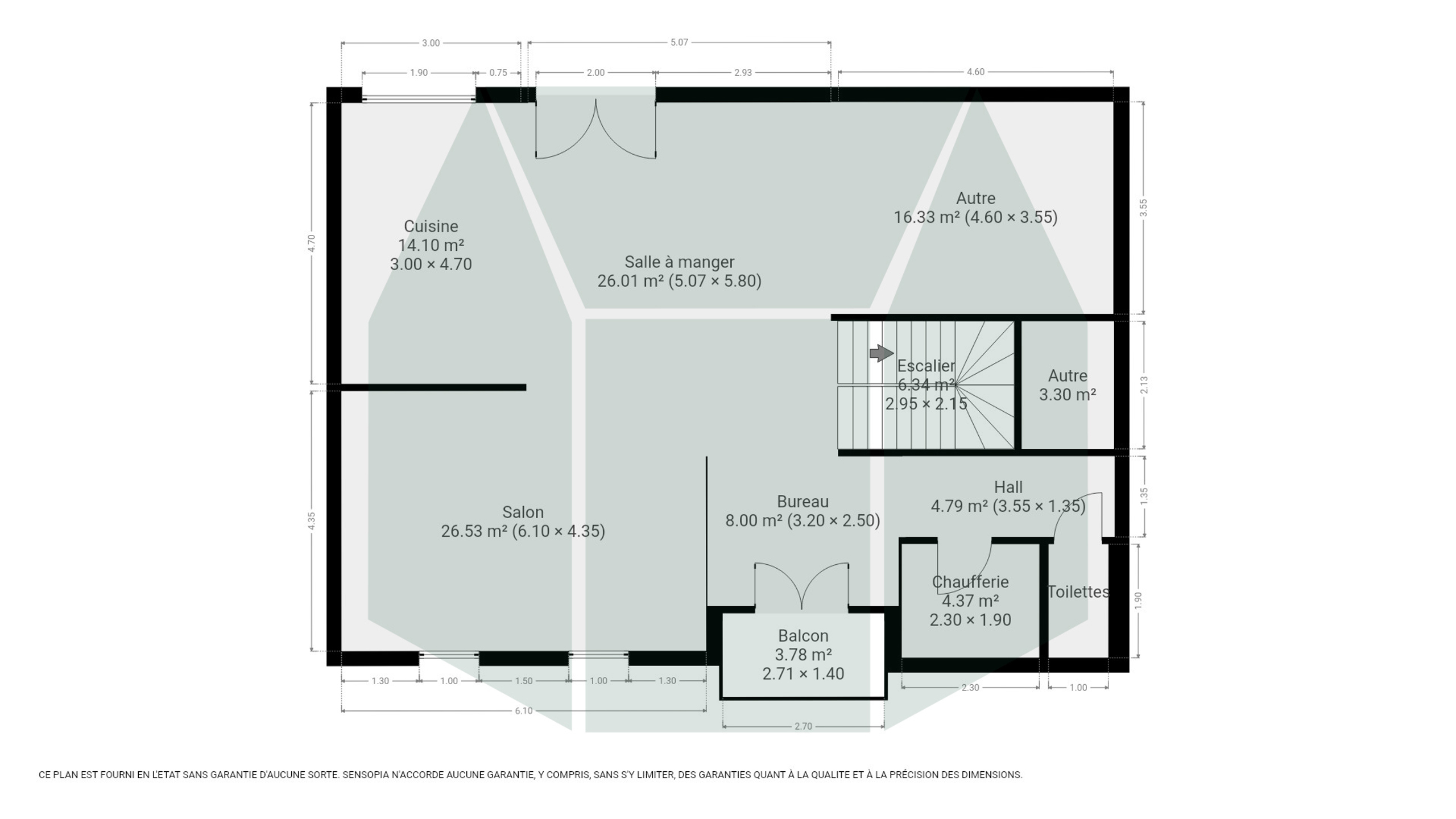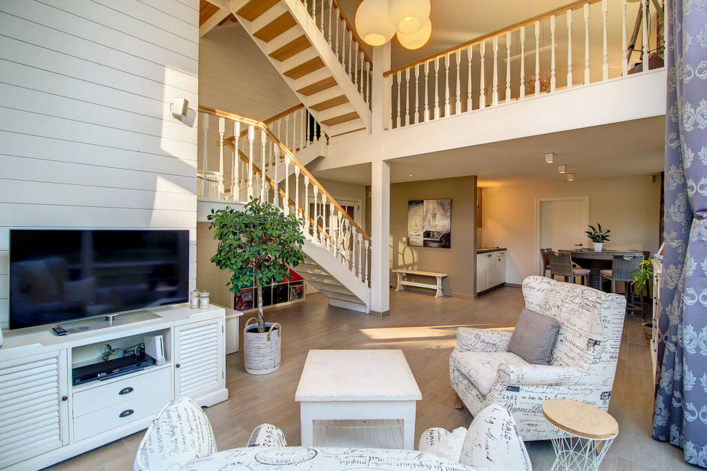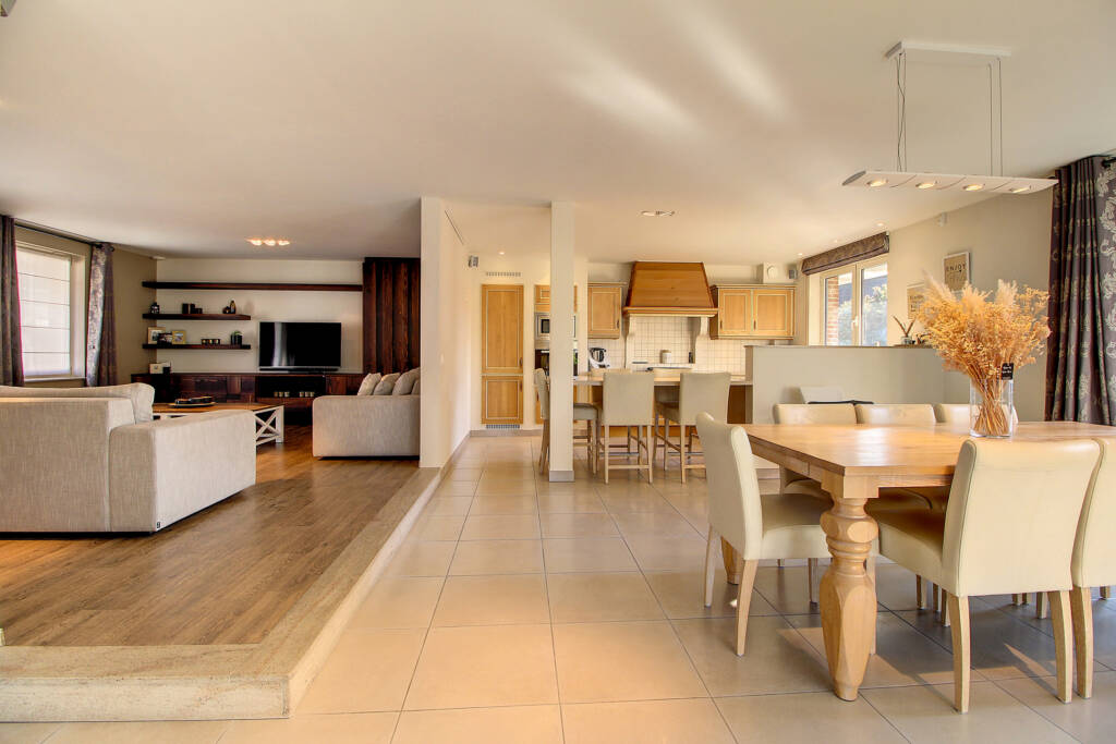 Au premier étage, une vaste pièce de vie s’ouvre à vous, comprenant un espace séjour ainsi qu’une cuisine équipée ouverte. Cette cuisine est équipée d’une plaque de cuisson au gaz, d’une hotte, d’un évier, d’un four, d’un micro-ondes, d’un réfrigérateur, d’un congélateur, d’un lave-vaisselle et d’un coin repas. Un espace bureau est également prévu pour ceux qui travaillant depuis chez eux. De plus, une chaufferie et un WC suspendu ajoutent à la commodité de cet étage.