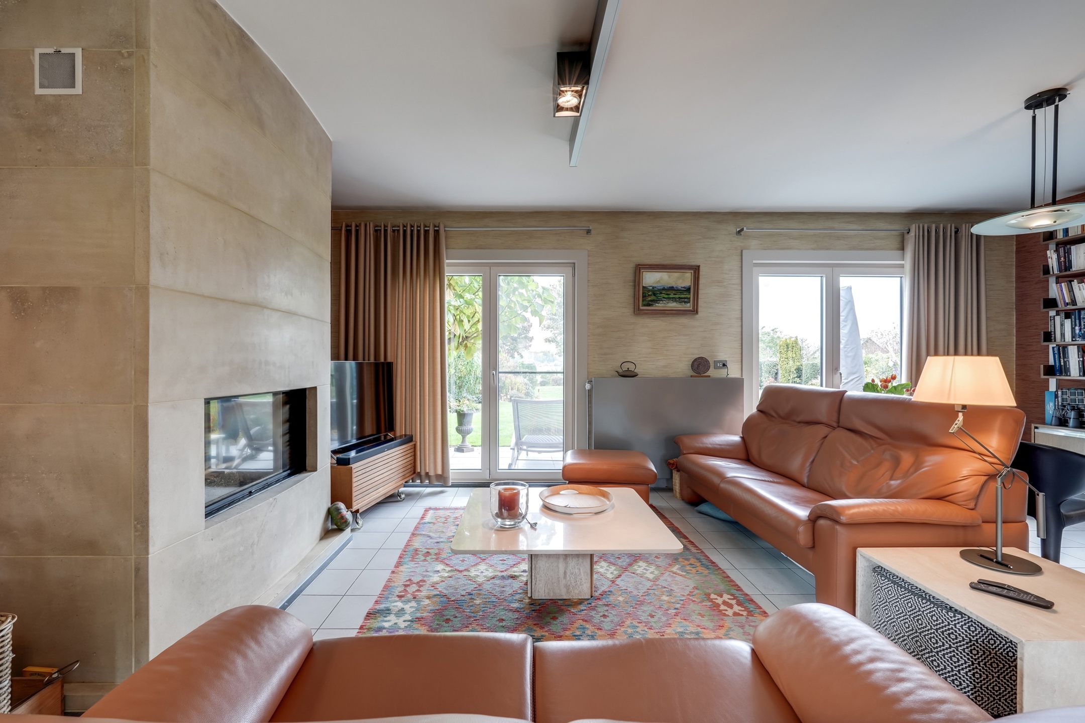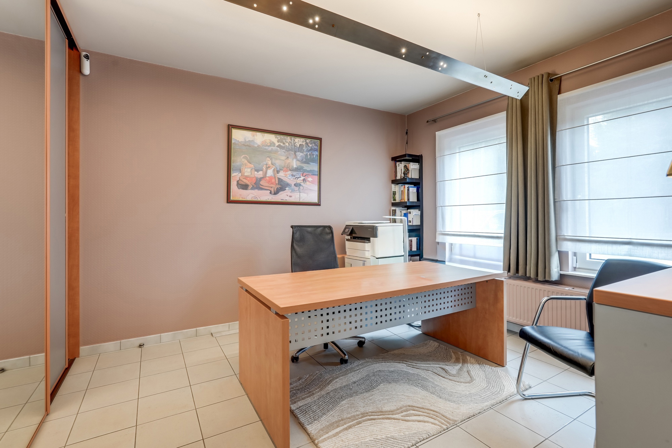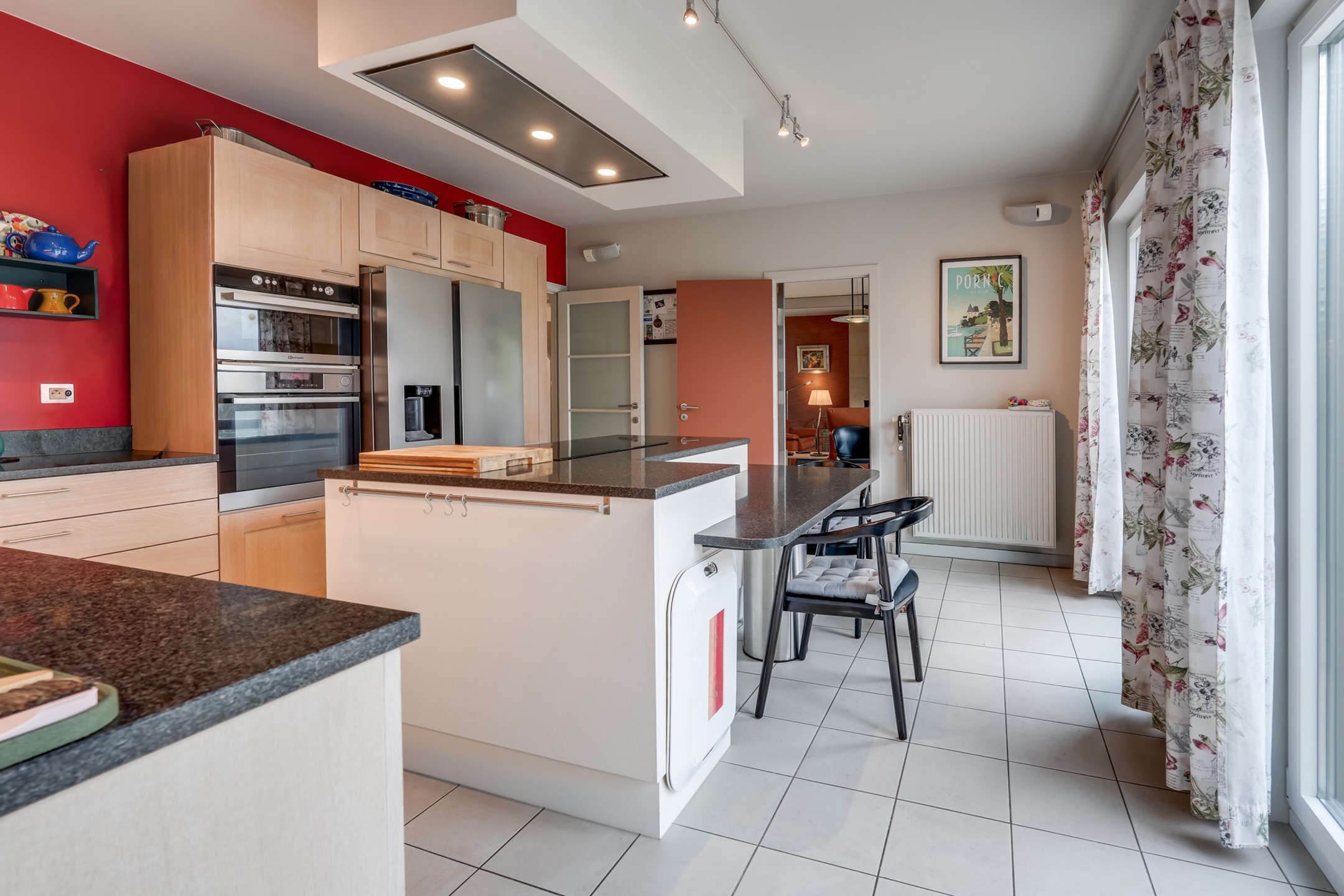 Op de begane grond treft u een ruime inkomhal met open trap, die toegang biedt tot een lichte woonkamer van 46 m² (woon- en eetkamer) met een sfeervolle houtkachel. De aangrenzende volledig uitgeruste keuken is modern en functioneel: nieuwe inductiekookplaat, dampkap, oven, microgolf, dubbele gootsteen, vaatwasser, kookeiland met eetgedeelte en veel bergruimte. Dit niveau omvat tevens een bureau/slaapkamer, een stookruimte en een garage.