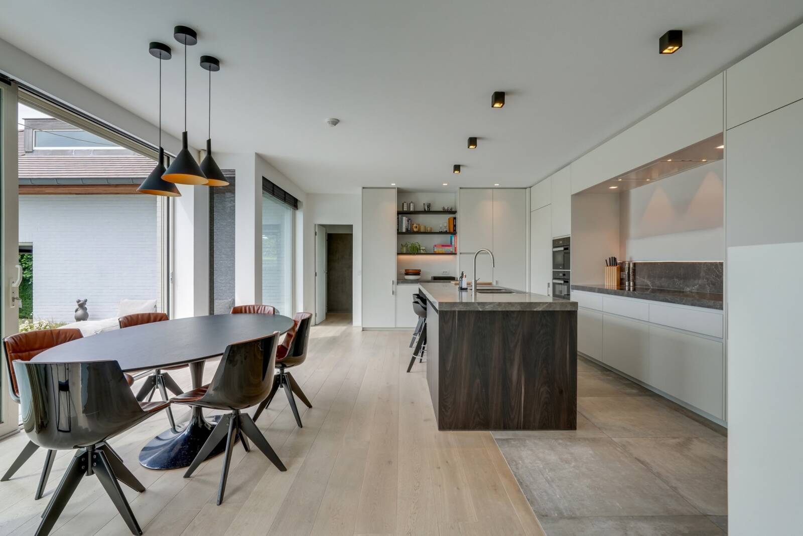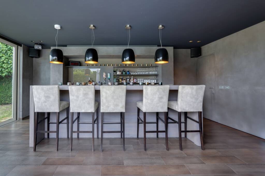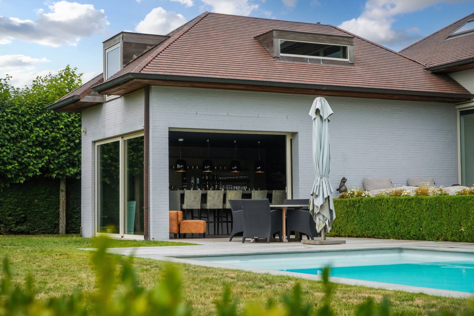 De volledig uitgeruste keuken met kookeiland en eethoek heeft een rechtstreekse toegang tot de tuin. Aansluitend bevindt zich een berging/bijkeuken die leidt naar een lager gelegen ruimte, ingericht als bar/poolhouse en voorzien van een grote schuifpui naar buiten.