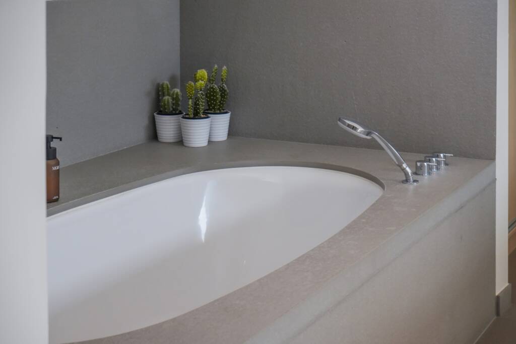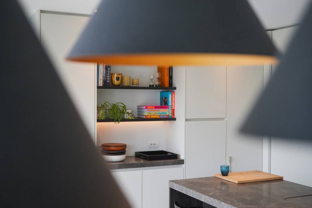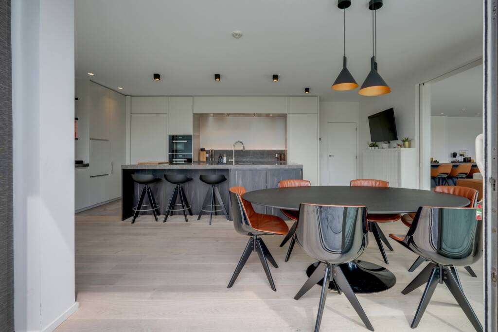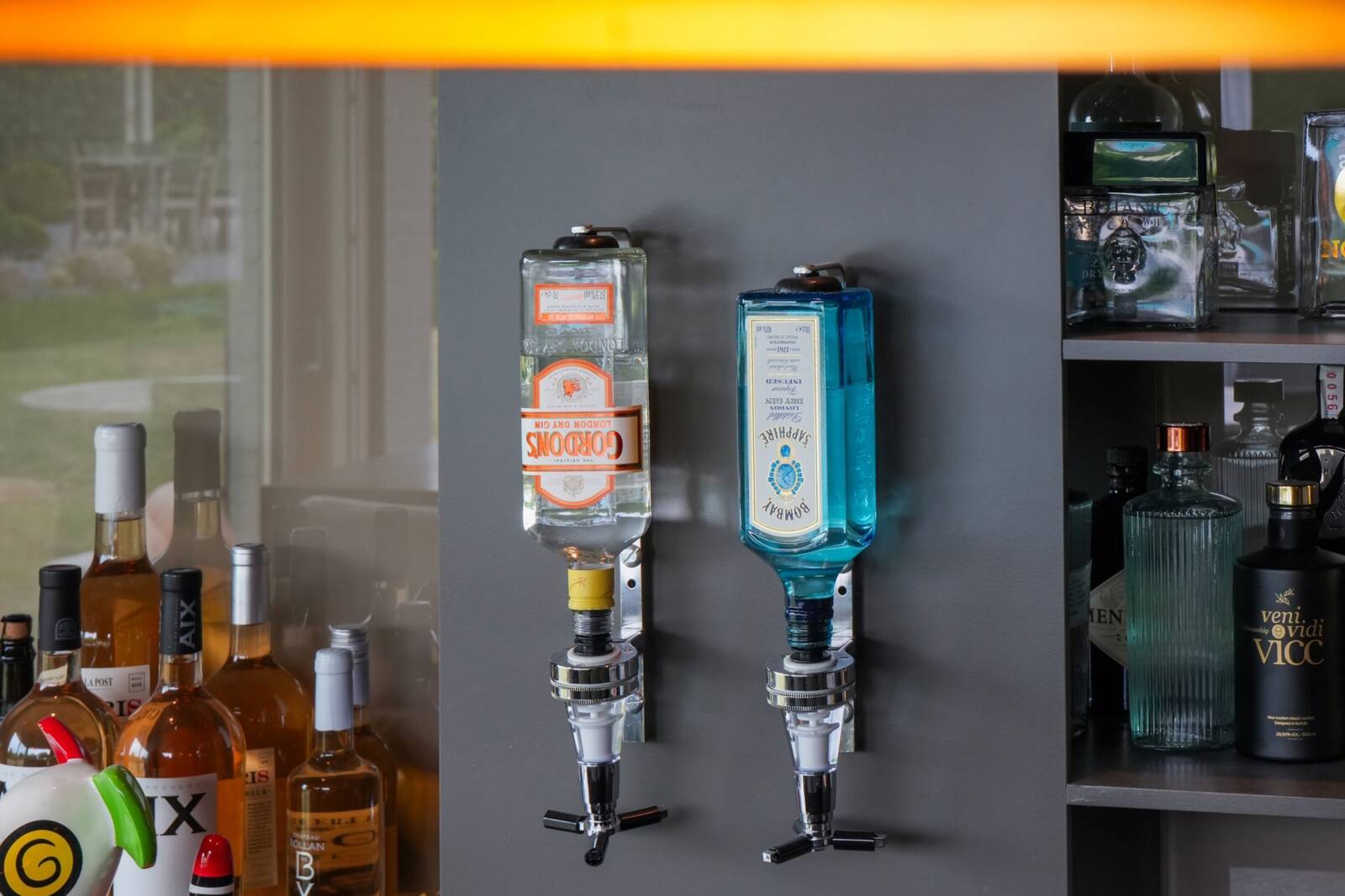De volledig uitgeruste keuken met kookeiland en eethoek heeft een rechtstreekse toegang tot de tuin. Aansluitend bevindt zich een berging/bijkeuken die leidt naar een lager gelegen ruimte, ingericht als bar/poolhouse en voorzien van een grote schuifpui naar buiten.