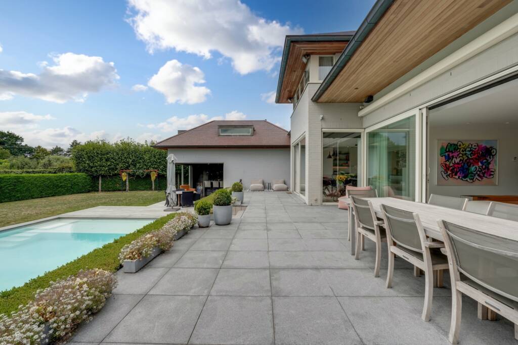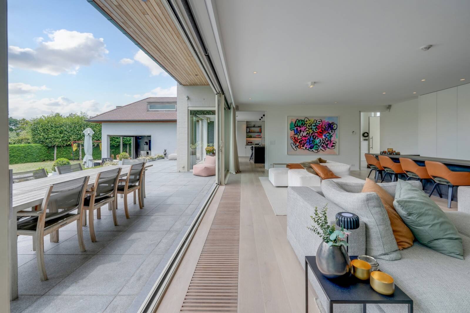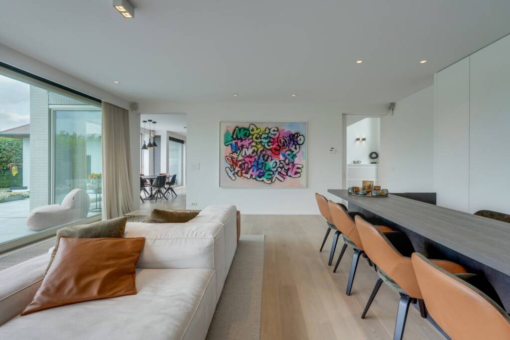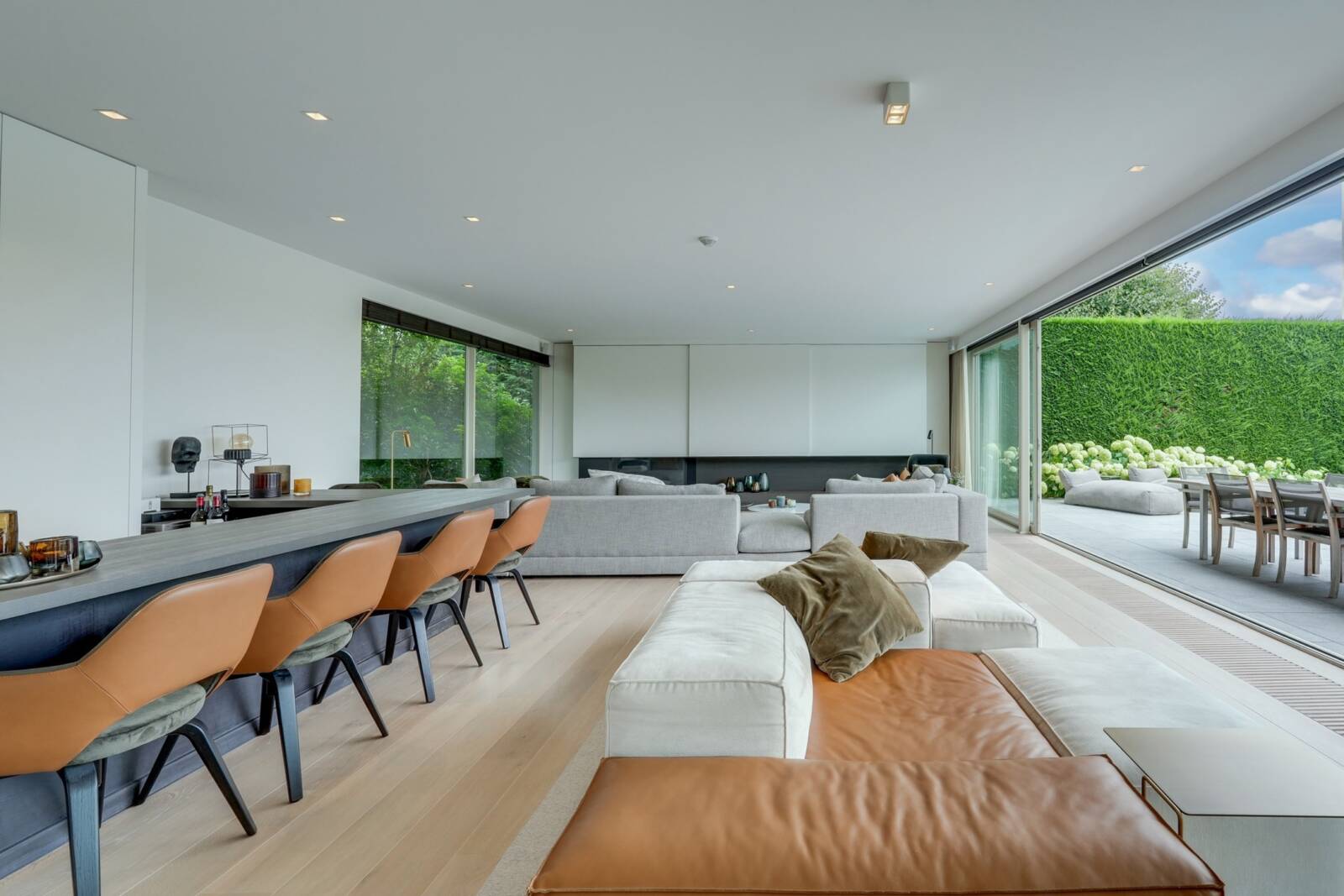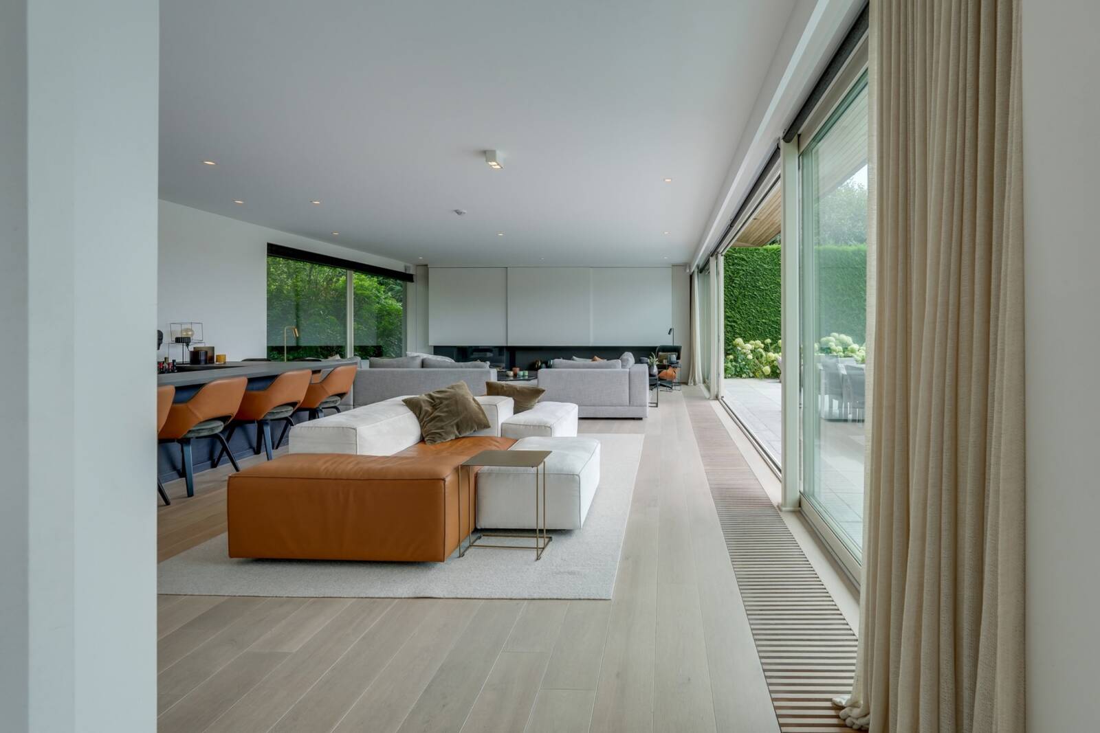 Bij binnenkomst leidt een met licht overgoten inkomhal naar een leefruimte met salon, eetkamer en barhoek. Grote raampartijen geven een vrij uitzicht op de tuin en het zwembad, terwijl de massieve parketvloer warmte en verfijning toevoegt.