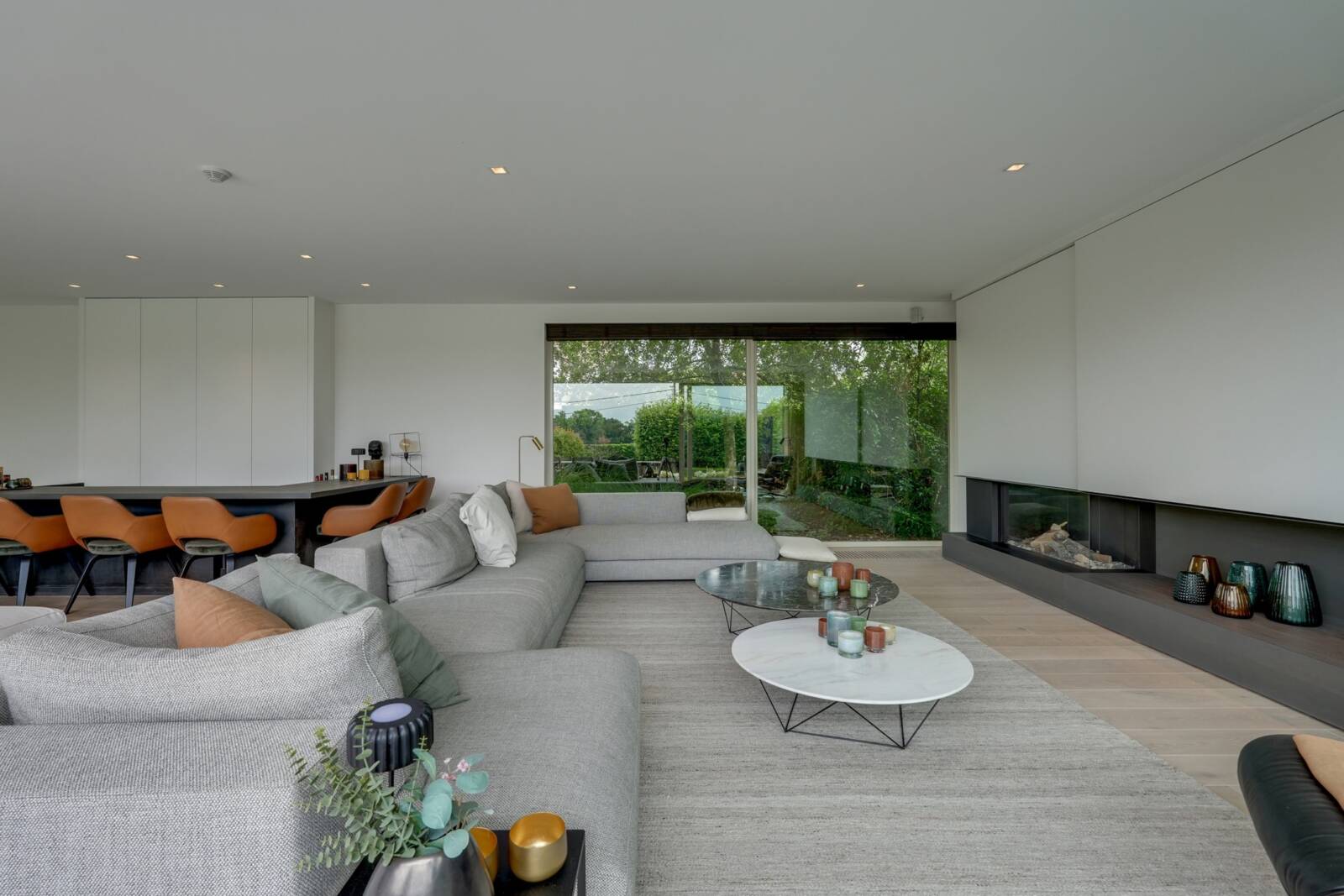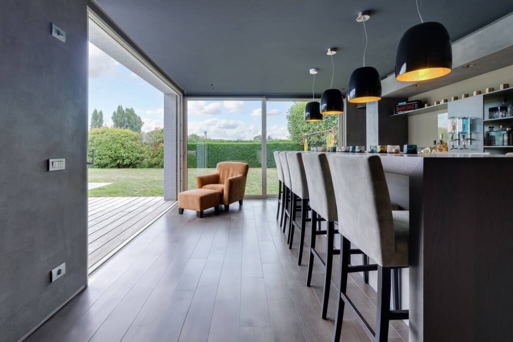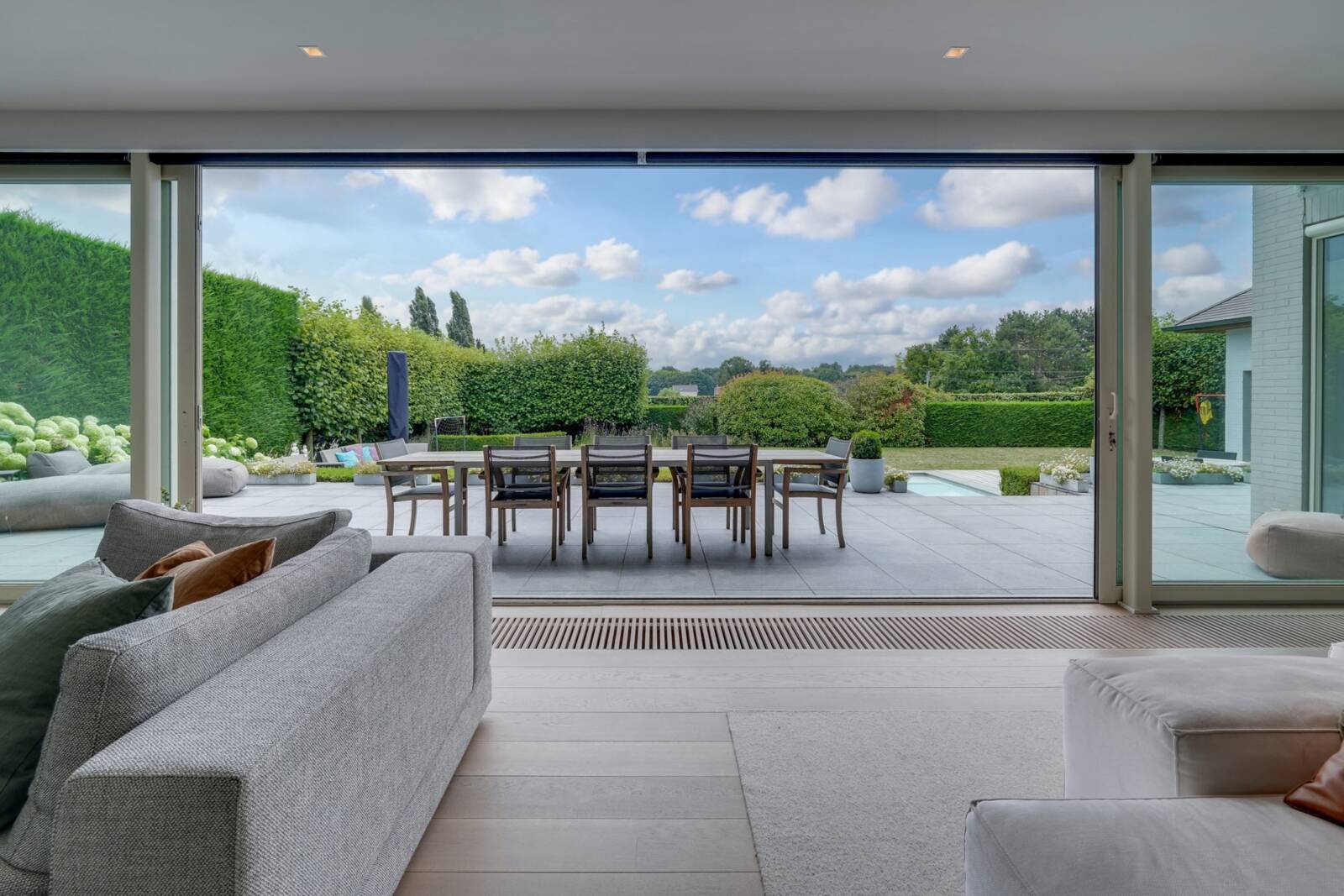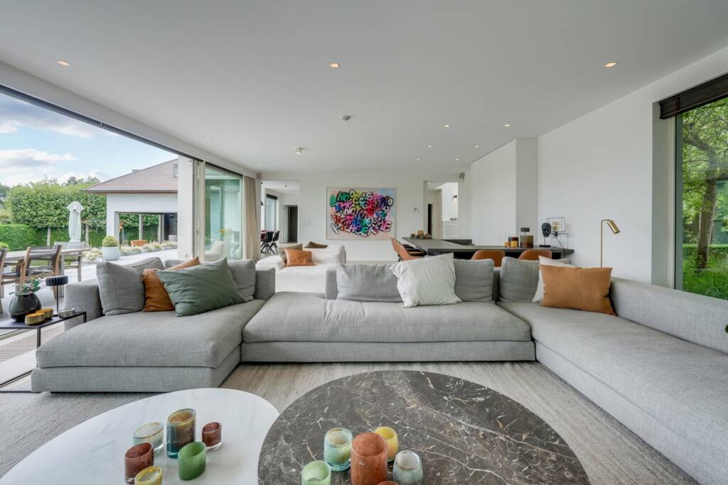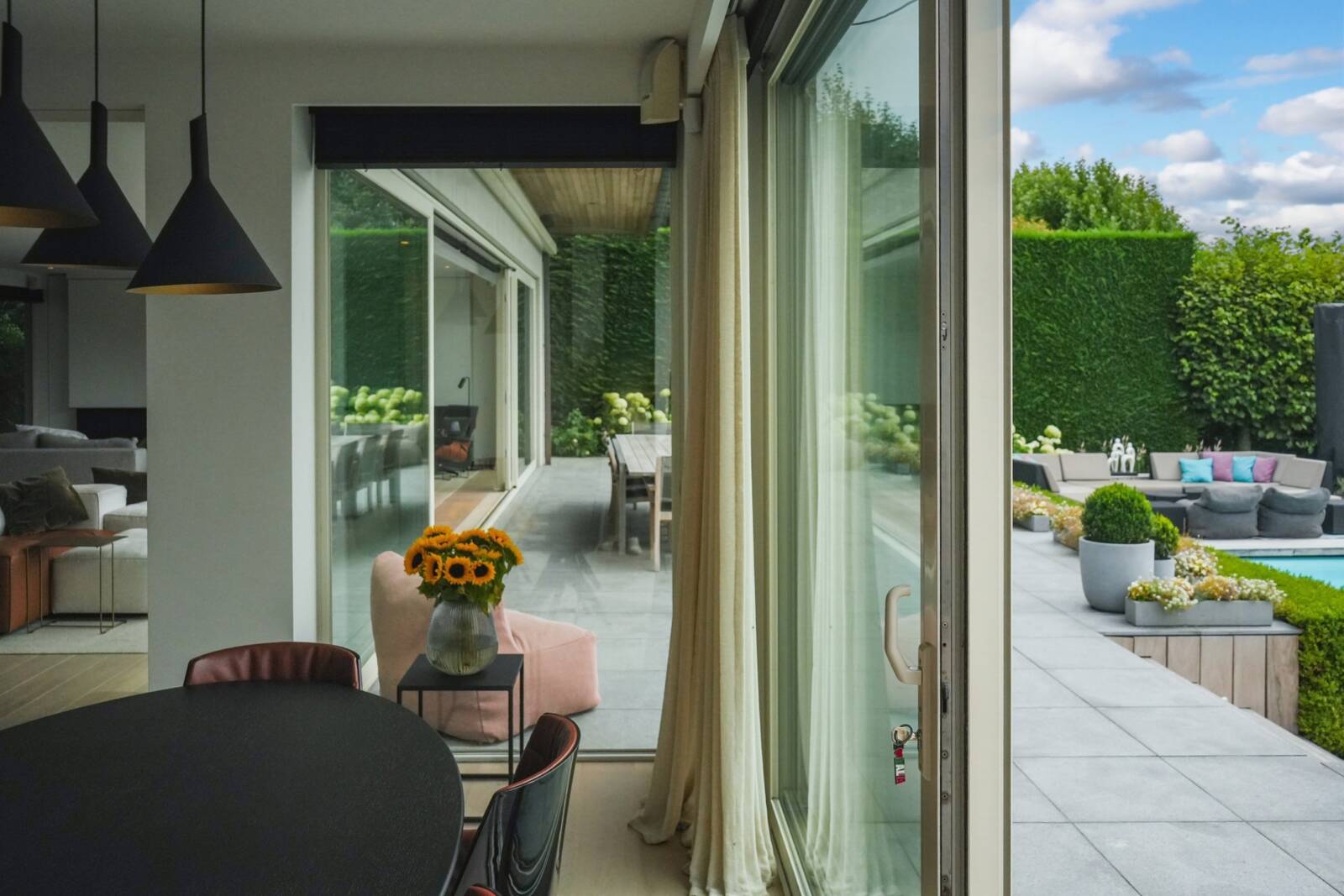 Bij binnenkomst leidt een met licht overgoten inkomhal naar een leefruimte met salon, eetkamer en barhoek. Grote raampartijen geven een vrij uitzicht op de tuin en het zwembad, terwijl de massieve parketvloer warmte en verfijning toevoegt.