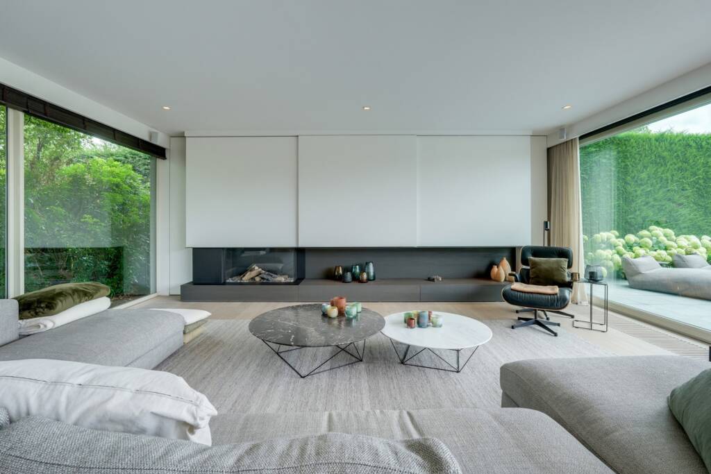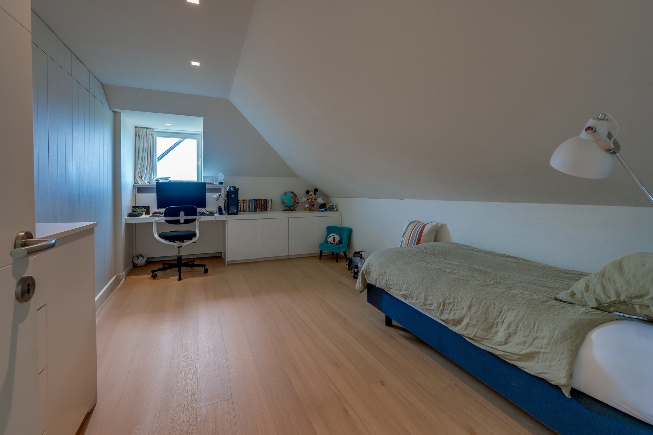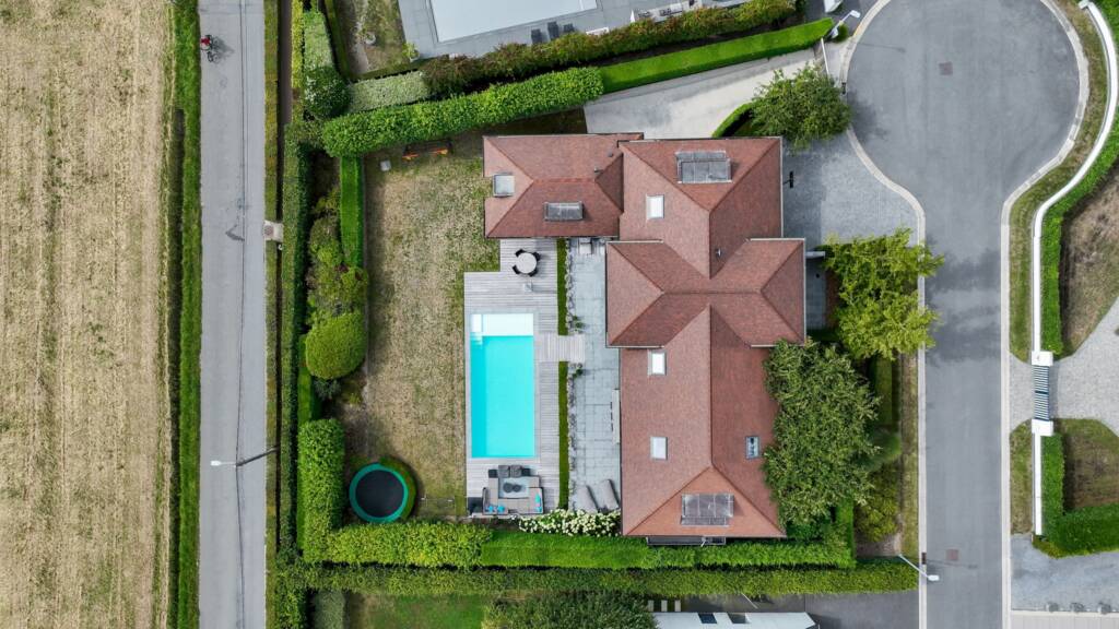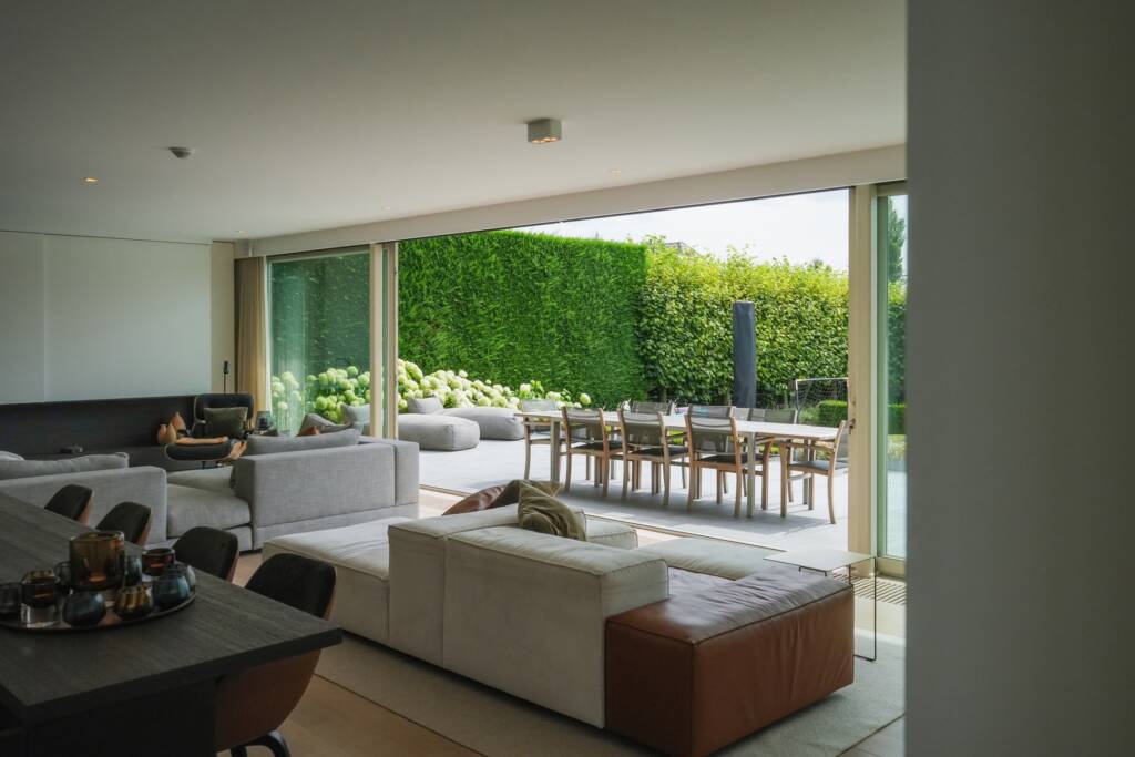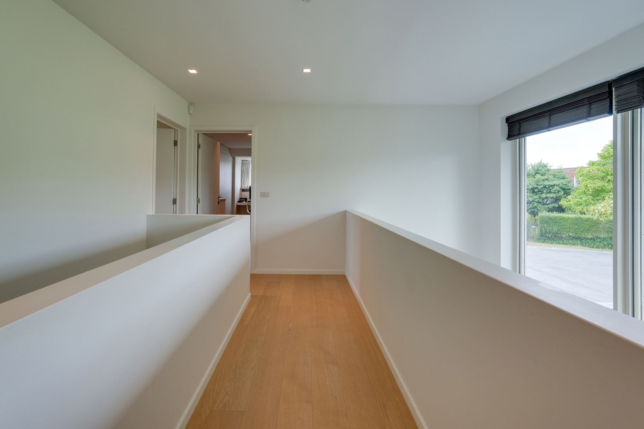 Bij binnenkomst leidt een met licht overgoten inkomhal naar een leefruimte met salon, eetkamer en barhoek. Grote raampartijen geven een vrij uitzicht op de tuin en het zwembad, terwijl de massieve parketvloer warmte en verfijning toevoegt.