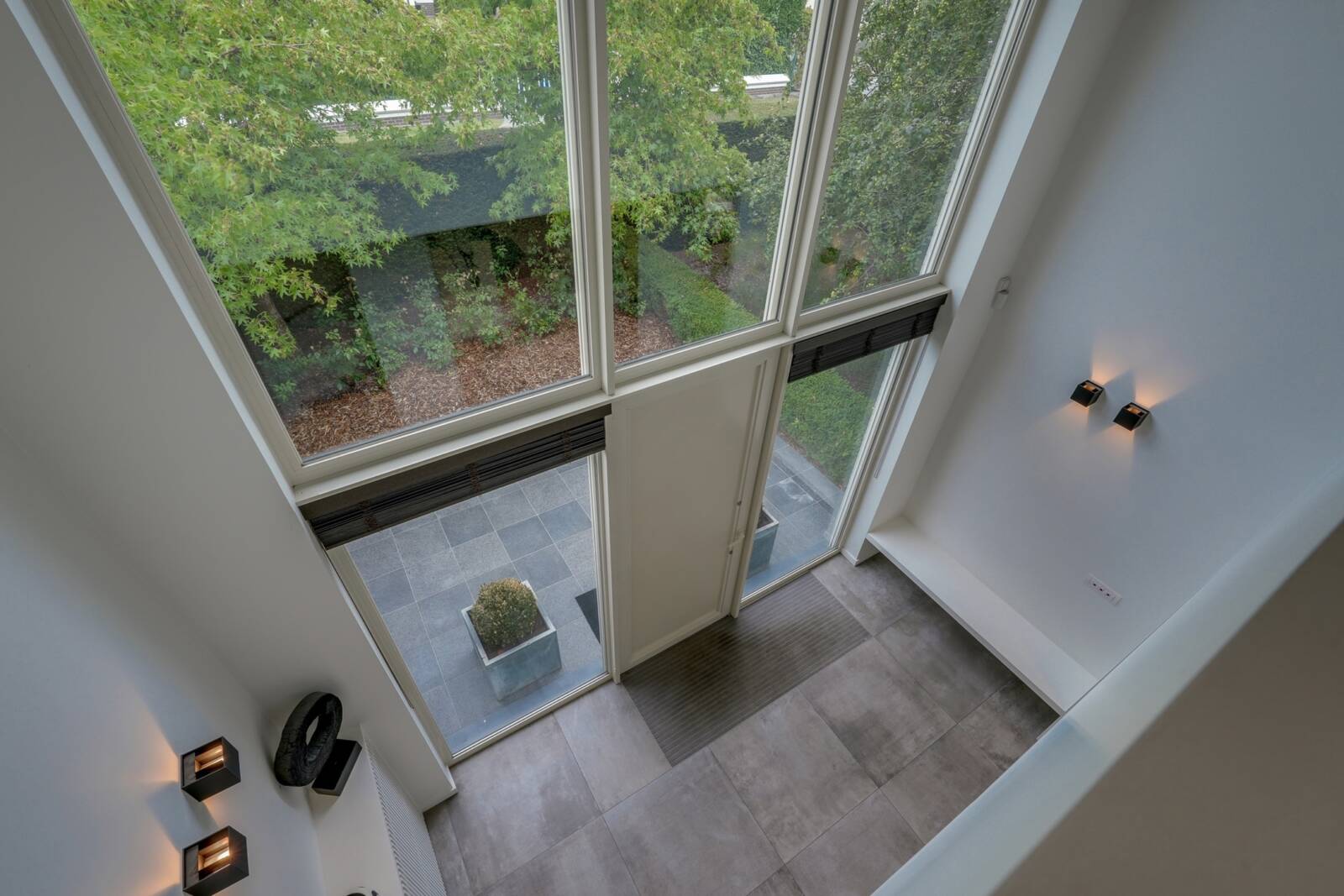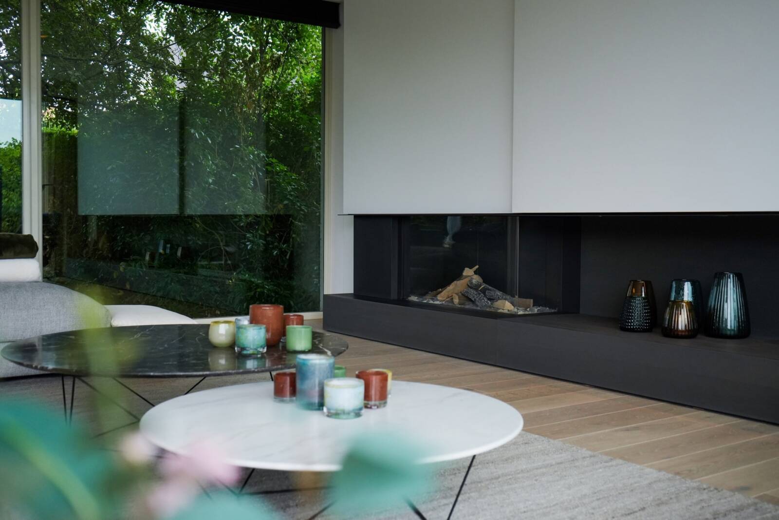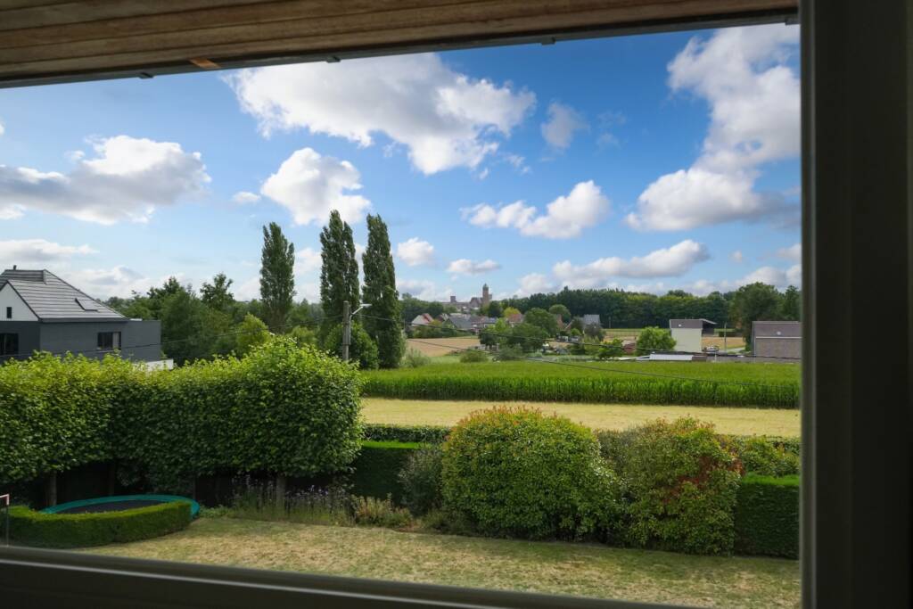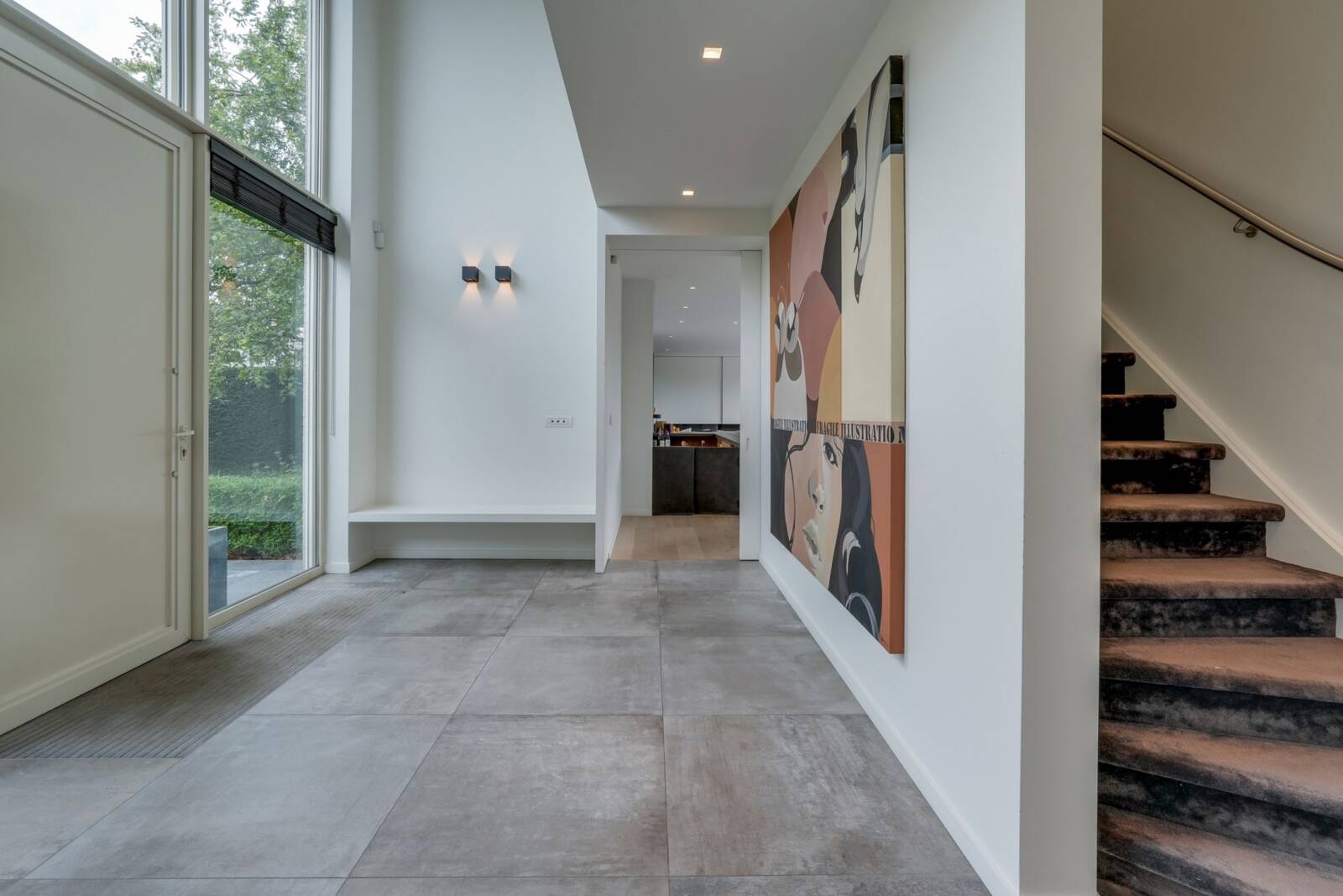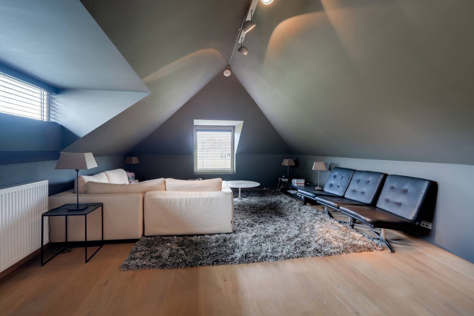 Bij binnenkomst leidt een met licht overgoten inkomhal naar een leefruimte met salon, eetkamer en barhoek. Grote raampartijen geven een vrij uitzicht op de tuin en het zwembad, terwijl de massieve parketvloer warmte en verfijning toevoegt.