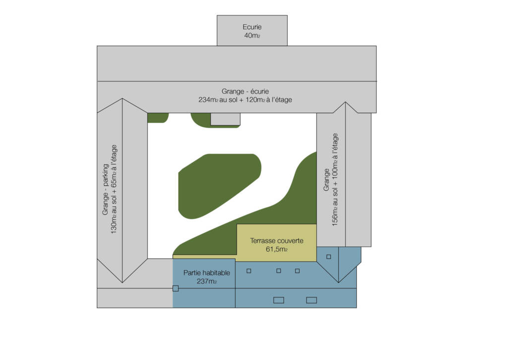 Trois ailes sont 3 utilisées comme espaces de stockage et une est aménagée en habitation.