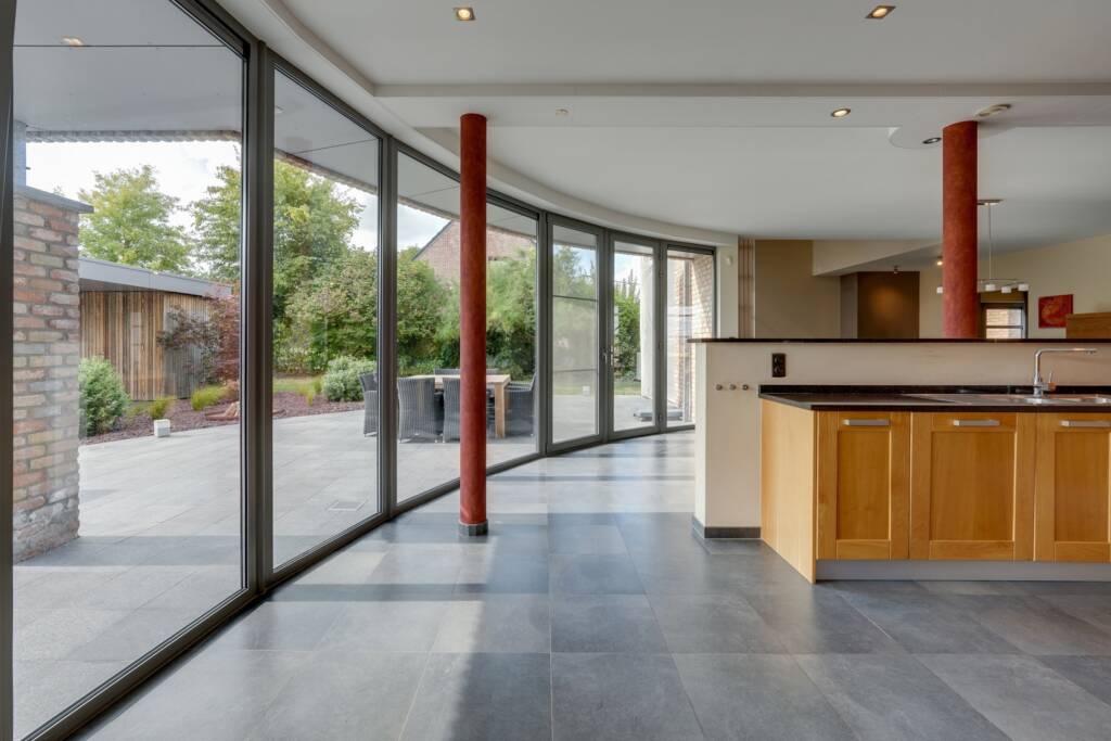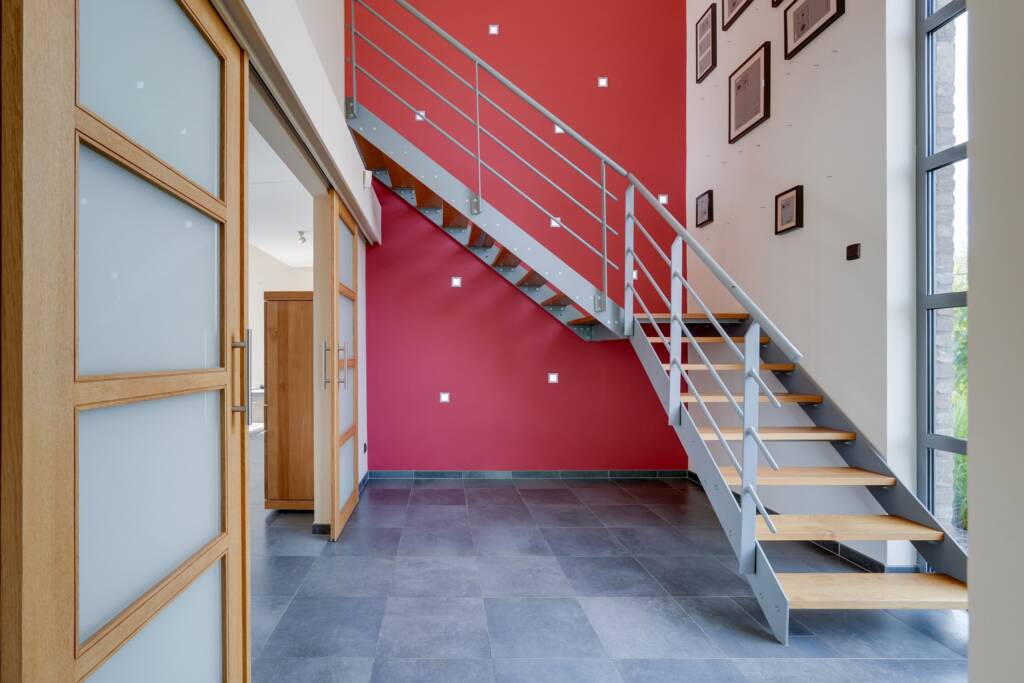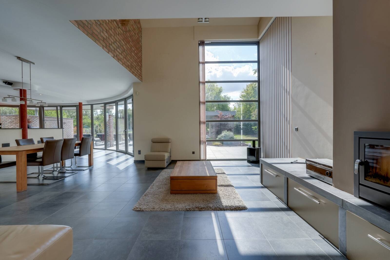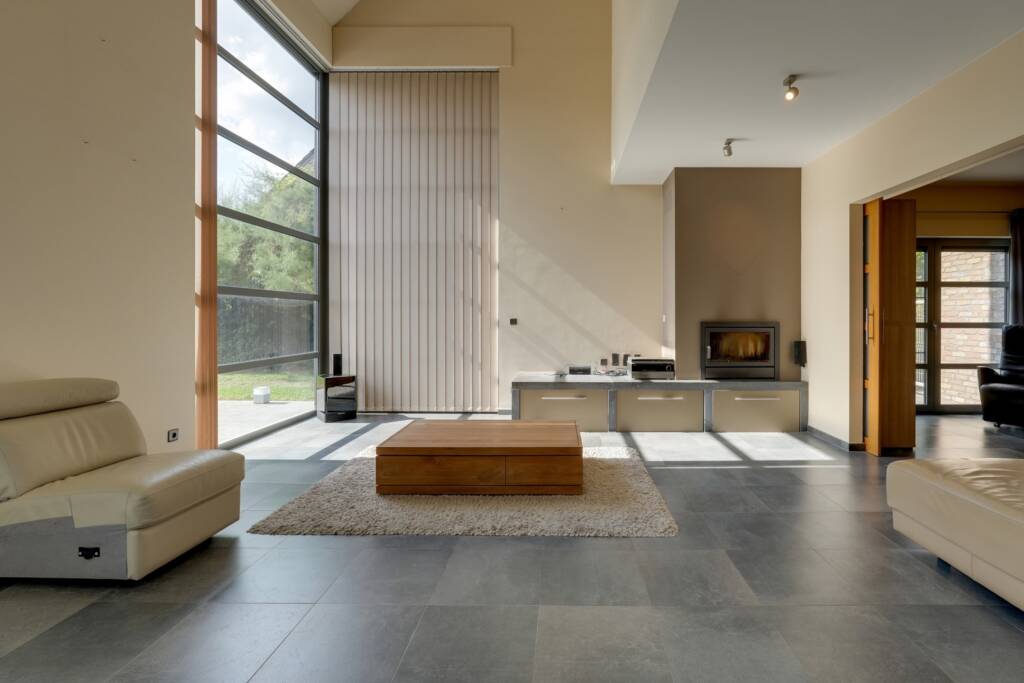 Ruime inkomhal die toegang geeft tot een grote, lichtrijke woonkamer met een houtinzet en een open ingerichte keuken.